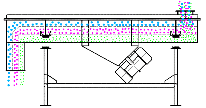 不銹鋼直線篩分機(jī)采用雙激振器驅(qū)動,當(dāng)兩臺激振器做同步、反向旋轉(zhuǎn)時,其偏心塊所產(chǎn)生的激振力在平行于電機(jī)軸線的方向相互抵消,在垂直于電機(jī)軸的方向疊為一合力,因此篩機(jī)的運(yùn)動軌跡為一直線。其兩電機(jī)軸相對篩面有一傾角,在激振力和物料自重力的合力作用下,物料在篩面上被拋起跳躍式向前作直線運(yùn)動,從而達(dá)到對物料進(jìn)行篩選和分級的目的。