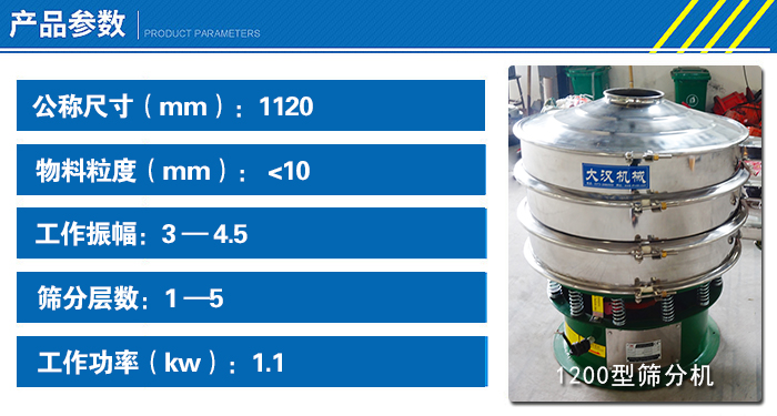 1200型篩分機篩網面積大,裝配有1.1功率的立式振動電機,所產生的激振力比其他小型號的要大很多,可沿著篩面有效充分篩分耐火材料,每小時篩分產量可達800KG。